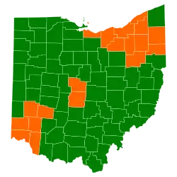 | Resultados por condados. Em laranja condados onde Rommney venceu, e em verde condados onde Santorum venceu. | ||||
