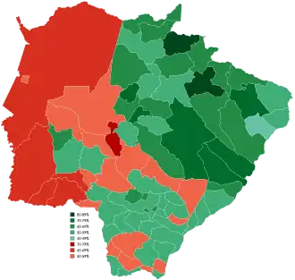 | Candidato mais votado por município no 1º turno (79): Andre Puccinelli (57) Zeca do PT (22)