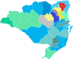 - ↑ As zonas eleitorais podem abranger mais de um município: A 3ª zona abrangia Blumenau e Gaspar; 6ª zona Caçador e Videira; 15ª zona Indaial e Rodeio ; 16ª zona Itajaí e Camboriú ; 20ª zona Imaruí e Laguna ; 22ª zona Mafra e Itaiópolis ; 27ª zona São Francisco do Sul e Araquari; 30ª zona Serra Alta e Campo Alegre ; 31ª zona Tijucas, Porto Belo e Nova Trento ; e a 33ª zona Tubarão e Jaguaruna.