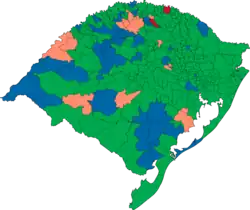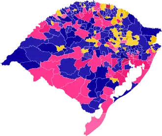 ![]() Candidato mais votado por município no 2.º turno (333): Collares (275+PA) ![]() Candidato mais votado por município no 1.° turno (333): Nelson Marchezan (183)