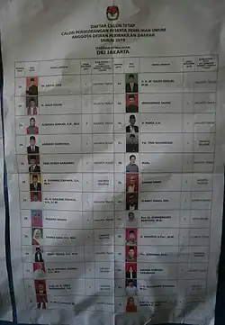 Os membros do Conselho Representativo do Povo (DPR) e dos Conselhos Regionais Representativos do Povo (DPRD) são eleitos a partir de distritos eleitorais multi-membros através de votação com um sistema de lista aberta .[11][16] O KPU regula que o número máximo de candidatos de um único partido é igual ao número de vagas disponíveis - com uma exceção em Aceh, onde o conselho provincial local estabeleceu o limite de 120% do número de cadeiras para as eleições do conselho regional.[17] Além disso, há uma cota de gênero que exige que pelo menos 30% dos candidatos registrados sejam do sexo feminino.[18]
