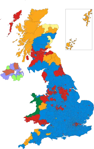 | Mapa dos resultados por círculo eleitoral. Azul - Conservadores Vermelho - Trabalhistas Laranja - Liberal Democratas Amarelo - Nacionalistas Escoceses | |||||||||