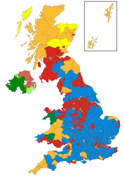 | Mapa dos resultados por círculo eleitoral. Em azul, vitória dos Conservadores; em vermelho, Trabalhistas; em laranja-claro, os Liberais Democratas; em amarelo, o Nacionalista Escocês. | |||||||||
