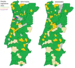 | Eleições legislativas portuguesas de 1915 163 deputados e 69 senadores ao Congresso da República | |||||||||||