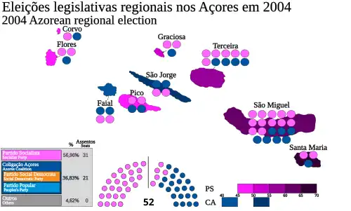 | Eleições legislativas regionais nos Açores em 2004 52 deputados na Assembleia Legislativa dos Açores | |||||||||||