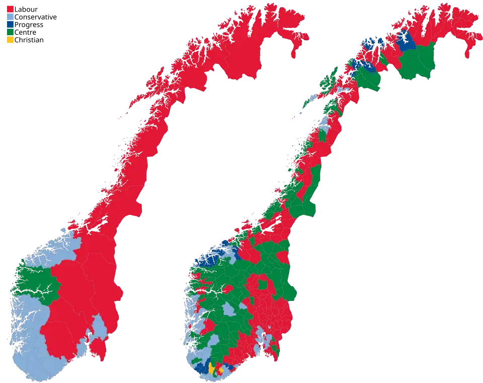 A Direção-Geral das Eleições (Valgdirektoratet) publicou os seguintes resultados finais, quando estavam contados 100% dos votos.