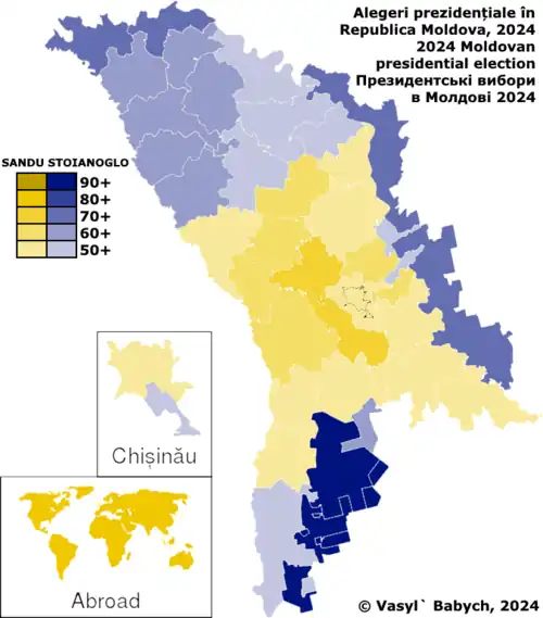 O The Guardian descreveu a eleição como uma escolha entre o Ocidente e a Rússia, com Sandu a representar o lado pró-União Europeia e Stoianoglo o lado pró-Rússia.[4] Renato Usatîi, que terminou em terceiro no primeiro turno, recusou-se a apoiar um candidato no segundo turno.[5] O jornal romeno Insider descreveu Victoria Furtună e Vasile Tarlev, que ficaram em quinto e sexto lugar, como apoiados pelo oligarca pró-Rússia Ilan Shor.[6]