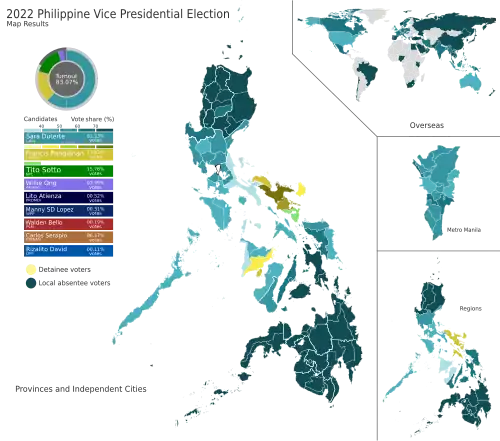 Na disputa vice-presidencial, por sua vez, Sara Duterte obteve uma vitória eleitoral ainda mais confortável ao conquistar 61.53% dos votos válidos frente a apenas 17.82% obtidos por Francis Pangilinan, companheiro na chapa de Robredo.[2]