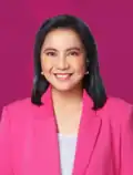 A vice-presidente em exercício Leni Robredo é considerada rival de Marcos,[44][45] tendo vencido por uma margem estreita contra ele na eleição vice-presidencial de 2016. Robredo, uma crítica das políticas de Duterte,[46] está oferecendo uma plataforma baseada em boa governança e transparência.[47][48] Ela está se apoiando em sua experiência como advogada de direitos humanos e trabalhadora de desenvolvimento.