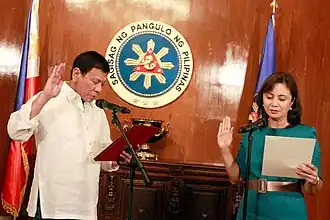 Nas eleições presidenciais e vice-presidenciais de 2016, o prefeito da cidade de Davao, Rodrigo Duterte, do Partido Demokratiko Pilipino–Lakas ng Bayar, ganhou a presidência contra outros quatro candidatos, enquanto o representante da Câmara Camarines Sur Leni Robredo do Partido Liberal venceu o senador Bongbong Marcos e outros quatro na eleição para vice-presidente que é a margem mais próxima desde 1965. Marcos colocou o resultado em protesto no Tribunal Presidencial Eleitoral.[4]