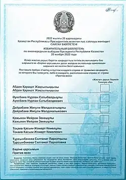 - ↑ «Президенттікке кандидаттарды тіркеу аяқталды». qazaqstan.tv (em cazaque). Consultado em 15 de novembro de 2022