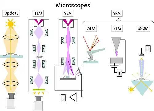 A diferença entre a SEM e a METé a capacidade da MET de investigar átomos individuais por seu comprimento de onda menor (maior energia) enquanto a SEM, apesar de não ter resolução para átomos, tem maior habilidade de tomar imagens de superfícies de maior área e de amostras mais volumosas e não apenas pequenos filmes, como a MET.