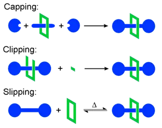 Para esses grupos de moléculas, existe um tipo de isomeria, a Isomeria Topológica (topoisômeros). Os Catenanos são Topoisômeros de seus ciclos não conectados porque não há como formar as unidades separadas sem ter que quebrar uma ligação. Já os Rotaxanos não formam par de isômeros com as unidades separadas já que, abstratamente, as rolhas podem ser deslocadas infinitamente e o sistema se confundir com as unidades separadas.[9] Para a preparação desses grupos de moléculas, necessitamos do Reconhecimento Molecular. O reconhecimento molecular acontece graças às interações intermoleculares, as “interações não-ligadas”. Existem vários tipos de interações intermoleculares, algumas mais fortes: Carga-Carga e Carga-Dipolo, Dipolo-Dipolo, Ligações de Hidrogênio, Interações de London, Interação , Transferência de Carga. Graças a essas interações, algumas posições na livre rotação de uma ligação simples são favorecidas possibilitando a síntese de espécies como Catenanos e Rotaxanos.