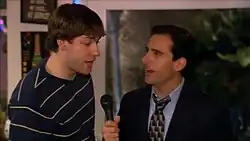 ![]() Jim canta no karaokê com Michael, que invadiu sua festa | |||