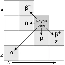 Os protões e neutrões não são partículas elementares, mas são, cada uma constituídas por três quarks : um protão é composto por dois quark up de carga +2/3 e por um quark down de carga −1/3 (uud), o que lhe confere uma carga de +1 ; um neutrão é constituído por dois quarks down e um quark up (udd), com carga nula. Esses quarks são capazes de alterar a sua natureza, em particular, de up para down. É este fenómeno que produz uma radiação β: nesta circunstância, no caso de uma desintegração β+, um quark up torna-se num quark down, mudando de um protão para um neutrão, com a emissão de um bosão W+.