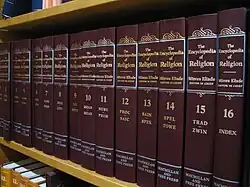 Os 16 volumes da primeira edição, publicada em 1987 sob a coordenação de Mircea Eliade, da obra Encyclopedia of Religion. | |