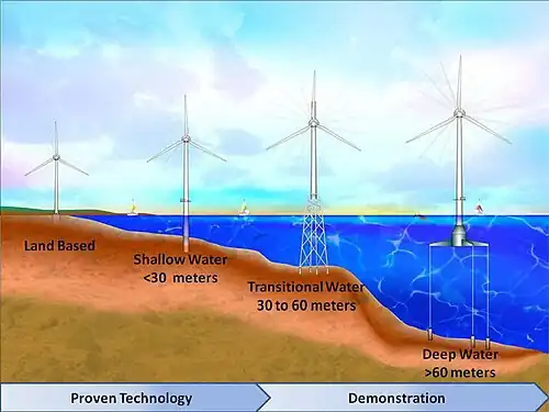 Para locais com profundidades superiores a cerca de 60–80 m, fundações fixas são economicamente inviáveis ou tecnicamente inviáveis, sendo necessárias turbinas eólicas flutuantes ancoradas ao fundo do oceano.[81][82][83] A Blue H Technologies, posteriormente adquirida pela Seawind Ocean Technology [en], instalou a primeira turbina eólica flutuante do mundo em 2007.[84][85][86] A Hywind é a primeira turbina eólica flutuante em escala total do mundo, instalada no Mar do Norte perto da Noruega em 2009.[87] A Hywind Scotland [en], comissionada em outubro de 2017, é o primeiro parque eólico flutuante operacional, com uma capacidade de 30 MW. Outros tipos de turbinas flutuantes foram implantados, e mais projetos estão planejados.[88]