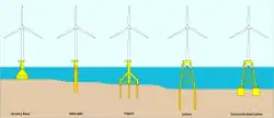 Os tipos de estruturas subaquáticas incluem monopile, tripé e jaqueta, com várias fundações no leito marinho, incluindo monopile ou múltiplas estacas, base gravitacional [en] e tubulões.[77] As turbinas offshore requerem diferentes tipos de bases para estabilidade, dependendo da profundidade da água. Até o momento, várias soluções existem:[9][78]