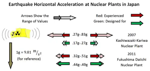 Entre 2005 e 2007, três usinas nucleares japonesas foram atingidas por terremotos que excediam em muito a aceleração do pico do solo (PGA) máxima usada em seus projetos.[29] O tsunami que se seguiu ao terremoto de Tohoku de 2011, inundando a usina nuclear de Fukushima I, colocou um pesou mais de duas vezes maior que projetado,[30] enquanto a aceleração do solo também excedia levemente os parâmetros projetados.[31]