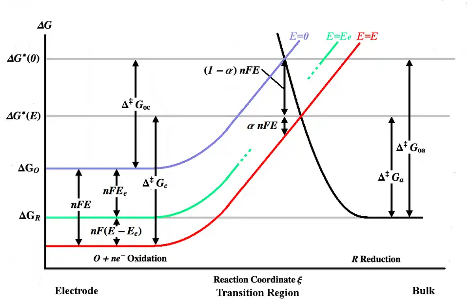 A figura acima representa várias curvas de energia livre de Gibbs em função da coordenada de reação ξ. A coordenada da reação pode ser aproximada para uma medida de distância, com o corpo do eletrodo à esquerda e a solução à direita. A curva azul mostra o aumento na energia livre de Gibbs para uma molécula oxidada conforme ela se aproxima da superfície do eletrodo quando nenhum potencial é aplicado. A curva de energia preta mostra o aumento da energia livre de Gibbs à medida que uma molécula reduzida se aproxima do eletrodo. As duas curvas de energia se cruzam em . A aplicação de um potencial ao eletrodo moverá a curva de energia livre de Gibbs da molécula oxidada para baixo (para a curva vermelha) por e o ponto de interseção se moverá para . Aumentar o potencial dos íons de zero para aumenta seu em , sendo a carga dos íons (ver potencial eletroquímico). Aumentar o potencial do eletrodo diminui o potencial dos íons próximos ao eletrodo em relação a ele, diminuindo, assim, seu . e são as energias de ativação (barreiras energéticas) a serem superadas pelas espécies oxidada e reduzida, respectivamente, para um potencial qualquer, enquanto e são as energias de ativação para . A curva de energia livre de Gibbs da molécula reduzida (curva preta) pode ser afetada pelo potencial, mas as conclusões não são invalidadas desde que a soma dos deslocamentos das curvas de oxidação e redução seja igual a .[5]