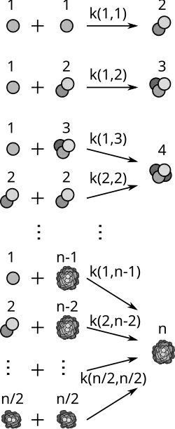 onde é o fluxo de entrada de massa vindo de partículas menores, e é o fluxo de saída para agregados maiores.