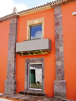 Na fachada da capela, sobre o portal rasga-se uma janela de sacada no pavimento superior, correspondente ao coro, com uma grande consola de pedra.