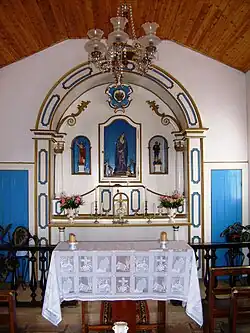 A fachada possuiu porta encimada por um óculo. No topo da cumeeira, uma cruz de pedra.