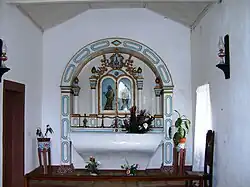 A fachada principal é rasgada por uma porta rematada em arco quebrado sobre impostas. Sobre a porta, uma cartela apresenta a data "1858". A fachada é rematada por uma cornija dividida em dois segmentos curvos cujas inclinações se aproximam das das águas do telhado. No ponto de encontro dos dois segmentos, ergue-se uma cruz e nos extremos laterais, sobre os cunhais, apoiam-se pináculos.
