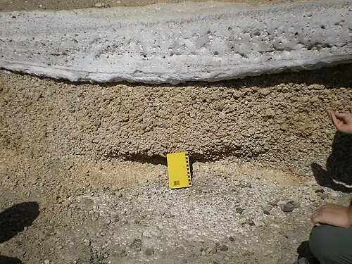 Depósito de cinzas de origem freatovulcânica a recobrir uma camada de bagacina de origem magmática.