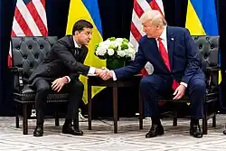 O presidente dos Estados Unidos, Donald Trump (na direita), se reunindo com o presidente ucraniano, Volodymyr Zelensky, em setembro de 2019. Trump foi acusado de tentar persuadir o governo ucraniano para tentar encontrar informações danosas a imagem de Joe Biden, seu concorrente na eleição presidencial de 2020, para melhorar suas chances no pleito.[1]
