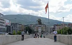 - ↑ «Skopje starts removal of 'irredentist' statues put up by Gruevski government». AMNA. Consultado em 9 de março de 2018