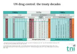 Esses três principais tratados internacionais de controle de drogas se apoiam mutuamente e se complementam. Um objetivo importante dos dois primeiros tratados é codificar medidas de controle aplicáveis internacionalmente, a fim de garantir a disponibilidade de entorpecentes e substâncias psicotrópicas para fins médicos e científicos e evitar seu desvio para canais ilícitos. Também incluem disposições gerais sobre tráfico e abuso de drogas.[3][4][5]