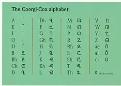 O alfabeto Coorgi-Cox usa uma conjunto de 26 consoantes e dígrafos; 5 vogais, 3 ditongos (ae, ai, oi) e um símbolo para vogal. O C se apresenta somente em Ch, não existem símbolos para Q nem X.. Cada letra representa um único som, não há letras maiúsculas. Já foi criado um grupos de fontes Coorgi-Cox para computador. [2]