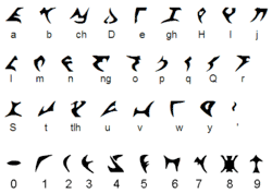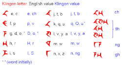 Suas letras mapeiam várias letras e dígrafos do inglês, mas não têm relação com a língua klingon de Marc Okrand. Como os outros dois alfabetos, provavelmente está escrito na mesma direção do inglês.