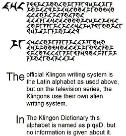 No Dicionário Klingon de Marc Okrand, o script Klingon é chamado pIqaD, mas nenhuma informação é dada sobre isso. Quando as letras Klingon são usadas nas produções de Star Trek, elas são meramente elementos gráficos decorativos, projetados para simular a escrita real e criar uma atmosfera apropriada.