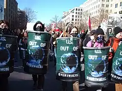 Manifestantes antiguerra em Washington, D.C., com escudos antitumulto improvisados