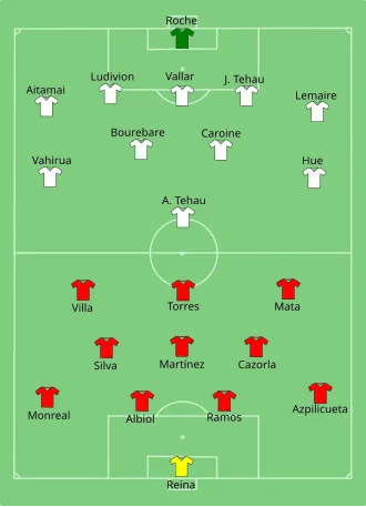 - ↑ a b «Tactical Line-up – Group B – Espanha-Taiti» (PDF) (em inglês). FIFA. 20 de junho de 2013. Consultado em 20 de junho de 2013
