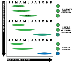 - ↑ a b Rebecca S. Taylor and Vicki L. Friesen (2017), «The role of allochrony in speciation», Molecular Ecology, 26 (13): 3330–3342, Bibcode:2017MolEc..26.3330T, PMID 28370658, doi:10.1111/mec.14126