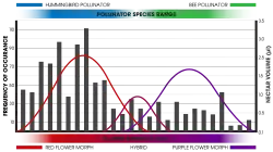 Em um caso notável, duas plantas com flores intimamente relacionadas (Erythranthe lewisii [en] e E. cardinalis [en]) se especificaram devido ao isolamento do polinizador em completa simpatria (especiação que ocorre sem nenhum isolamento físico e geográfico).[4] A E. lewisii mudou significativamente em relação à sua espécie irmã, pois desenvolveu flores cor-de-rosa, pétalas largas, estames mais curtos (a parte da planta que produz o pólen) e um volume menor de néctar. Ela é totalmente polinizada por abelhas, quase sem cruzamento na natureza. A E. cardinalis é polinizada por beija-flores e apresenta flores vermelhas em forma de tubo, estames maiores e muito néctar. Acredita-se que o volume de néctar, bem como um componente genético (uma substituição de alelo que controla a variação de cor), mantém o isolamento.[48][49] Um padrão semelhante foi encontrado na Aquilegia pubescens [en] e na A. formosa. Nesse par de espécies, a A. pubescens é polinizada por mariposas, enquanto a A. formosa é polinizada por beija-flores[1]:197 Ao contrário de Erythranthe, essas espécies residem em habitats diferentes, mas exibem formas híbridas onde seus habitats se sobrepõem;[50] embora permaneçam espécies separadas, sugerindo que as flores híbridas podem ser menos atraentes para seus hospedeiros polinizadores.[1]:197