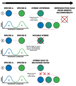 A especiação ecológica pode ocorrer de forma pré-zigótica (barreiras à reprodução que ocorrem antes da formação de um zigoto) ou pós-zigótica (barreiras à reprodução que ocorrem após a formação de um zigoto). Exemplos de isolamento pré-zigótico incluem o isolamento do habitat, o isolamento por meio de sistemas de polinização e o isolamento temporal. Exemplos de isolamento pós-zigótico envolvem incompatibilidades genéticas de híbridos, híbridos de baixa aptidão e seleção sexual contra híbridos.