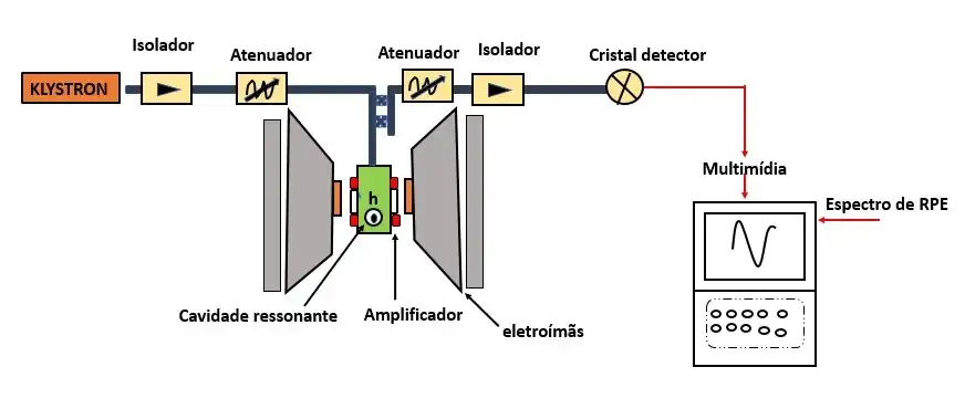 O T-mágico está conectado ao Klystron através de um isolador e um atenuador. O isolador é um dispositivo que impede que as ondas refletidas voltem a entrar no Klystron, que por sua vez poderia produzir instabilidade na oscilação. O atenuador é um dispositivo que é capaz de absorver uma fração variável da potência gerada pelo Klystron, ele consiste em um material dielétrico de superfície condutora. A amostra deve ser introduzida na cavidade de tal maneira que esta coincida com o máximo do campo magnético da onda estacionária. A seguir um desenho esquemático de um equipamento de RPE.