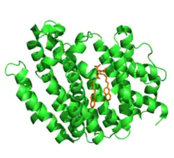 Esqualeno-sintase (SQS) é uma enzima localizada na membrana do retículo endoplasmático. A enzima participa na via biosintética isoprenoide, catalizando uma reação de duas vias na qual duas moléculas idêntica de farnesil-pirofosfato são convertidas em esqualeno, com o consumo de NADPH.[2] A catálise da SQS é o primeiro passo na síntese do esterol, já que o esqualeno produzido é convertido exclusivamente em vários esterois, como o colesterol, por via de um complexo e multi-segmentado caminho. A esqualeno-sintase pertence a família de proteínas esqualeno/fitoeno. Está presente em animais, plantas e leveduras.[3]