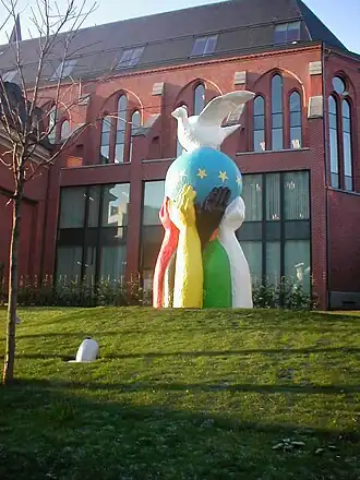 A estátua foi fabricada, modelada, polida e pintada por crianças com deficiência visual sob a supervisão do artista francês Bernard Romain, que queria demonstrar que a deficiência não era um fator desqualificante. Os braços entrelaçados de diferentes cores simbolizam os povos culturalmente diversos da Europa, que juntos erguem uma esfera que lembra a bandeira da UE, coroada pela pomba da paz.[3]