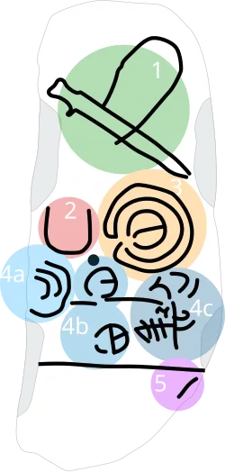 - Nº 5: sulco nas costas, ou seja uma incisão nas costas que represente a coluna vertebral. Também aparece nas estátuas celtas como o guerreiro de Hirschanden.