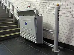 | Embora tenham sido instalados elevadores entre as plataformas e a plataforma intermédia, logo em 1998, nunca chegou a ser incorporado um ascensor entre a plataforma intermédia e a superfície, ficando a estação inapta para acessibilidade a cadeiras de rodas apesar de estar dotada de escadas rolantes. Para reduzir as dificuldades técnicas e os custos inerentes a esta intervenção, o Metropolitano de Lisboa optou por instalar uma simples plataforma elevatória, apoiada na escadaria estática situada entre cada par de escadas rolantes, orçamentada em 29 541 €.[6] Este equipamento, que assegura a ligação entre a plataforma intermédia e a superfície, entrou em funcionamento em setembro de 2015. |