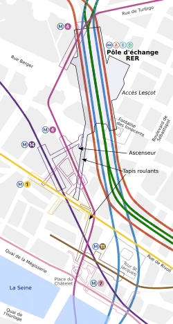 Châtelet está ligada por um outro corredor subterrâneo no extremo sul da estação Châtelet - Les Halles do RER, no extremo norte do que é novamente conectado à estação de metro Les Halles. A distância de Linha 7 em Châtelet às linhas RER em Châtelet - Les Halles é de aproximadamente 750 metros (2.460 pés). É a nona estação mais movimentada do sistema de metrô.