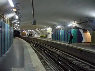 A partir da década de 1950 até 2007, os pés-direitos foram revestidos com uma curvatura metálica com montantes horizontais azuis e quadros publicitários dourados iluminados. Antes de sua remoção para a renovação da estação no quadro do programa "Renouveau du métro" da RATP, foi completada com assentos "coque" característicos do estilo "Motte", em branco.