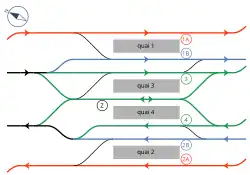 As vias férreas das três linhas da rede expressa regional são todas orientadas paralelamente a um eixo noroeste - sudeste apresentando um ângulo de cerca de cinco graus em relação ao eixo norte-sul. As sete vias servem quatro plataformas: as duas plataformas centrais são reservadas aos trens da linha D enquanto que as plataformas situadas nas extremidades laterais leste e oeste são reservadas aos trens das linhas A e B. Para estes últimos, a correspondência pode ser feita na mesma plataforma de acordo com os destinos. A via da linha A em direção a Gare de Lyon e a via da linha B em direção a Saint-Michel - Notre-Dame são assim situadas na plataforma leste. Inversamente, a via da linha B em direção a Gare du Nord e a via da linha A em direção a Auber são todas as duas situadas na plataforma oeste. Enquanto que as vias da linha B ficam ao lado daquelas da linha D, as vias da linha A estão situadas nos lados leste e oeste. Em cada plataforma, os trens viajam na mesma direção. Assim, sobre as passagens da estação, os trens na direção da Gare du Nord passam do sudeste para o noroeste e aqueles em direção de Saint-Michel do noroeste ao sudeste.