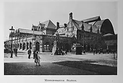 A estação atual foi projetada pelo arquiteto-chefe da North Eastern Railway, William Peachey, com uma fachada ornamentada em estilo gótico. Por trás disso, existia um telhado geral de design elíptico. Construído em ferro forjado com design treliçado, com vidro cobrindo a metade central e madeira (interna) e ardósia (externa) cobrindo as partes externas. As duas telas finais foram envidraçadas com revestimento de madeira nas bordas externas. O telhado era alto em relação à sua largura.[7]