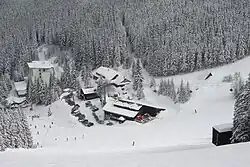 A base típica de uma área de esqui inclui uma bilheteria, um alojamento, uma escola de esqui, uma loja de aluguel/reparo de equipamentos, restaurante/bar, lojas, ponto de ônibus e estacionamento.[5]